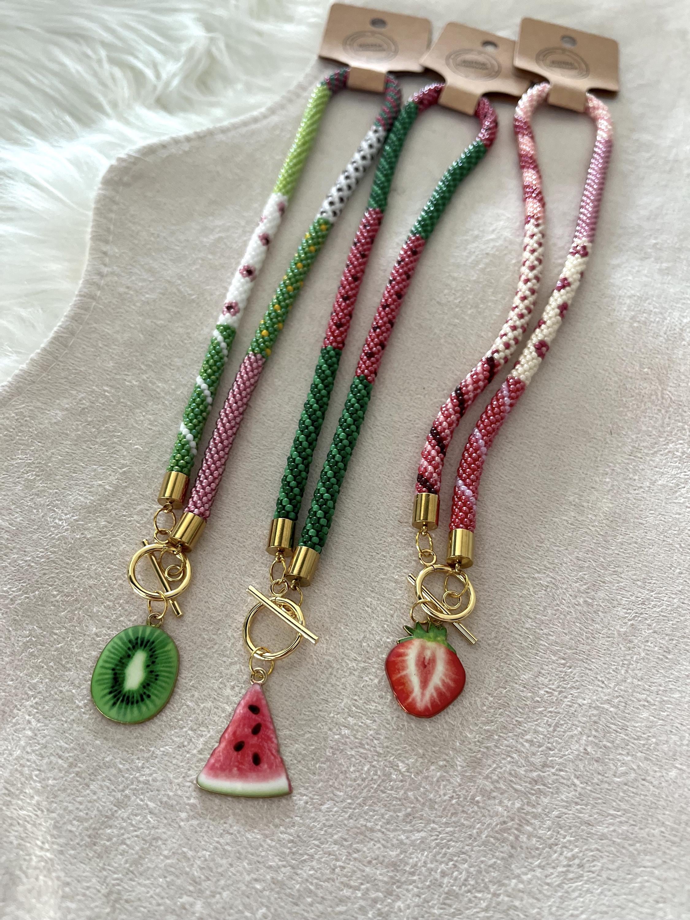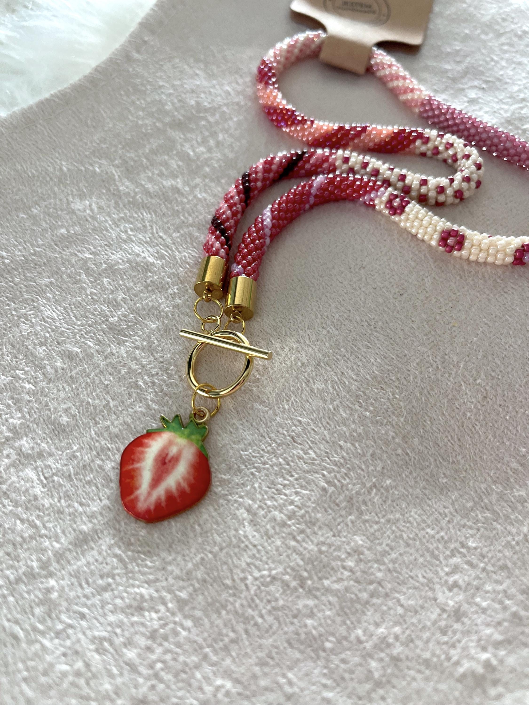 Each necklace takes around 6 hours to create and requires great attention to detail and patience, making it truly one of a kind. Finished with a gold-toned metal clasp and a charming strawberry slice pendant, this accessory adds a playful yet elegant touch to your summer wardrobe.