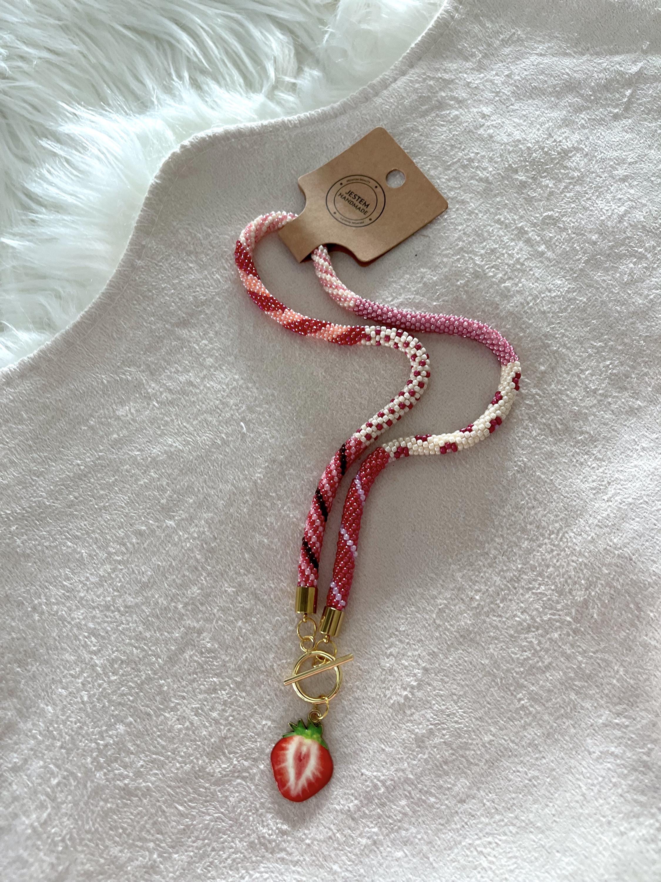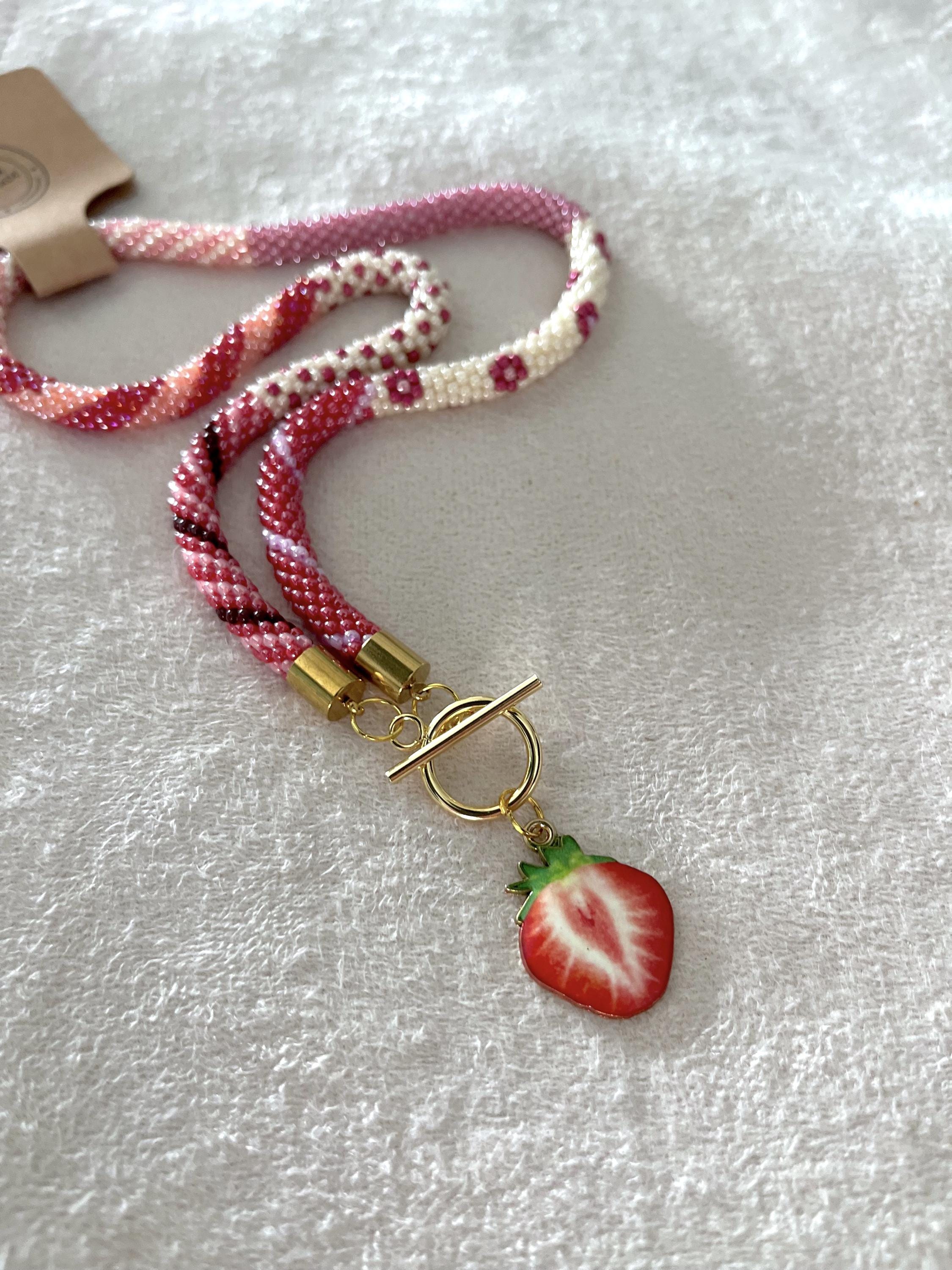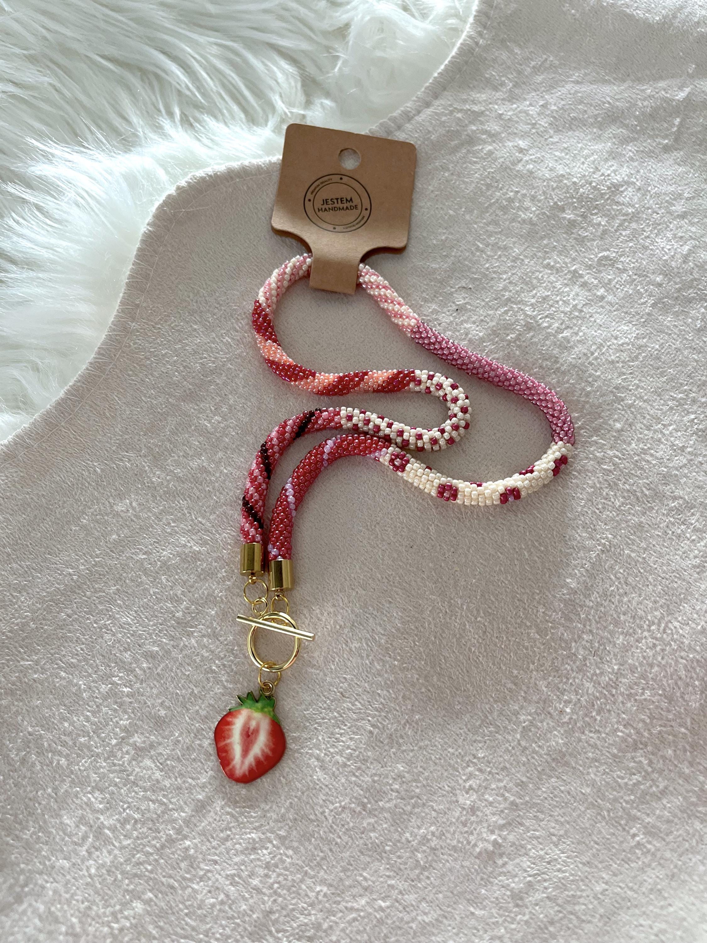 Bring a splash of summer to your style with this vibrant, handmade beaded necklace inspired by juicy strawberry colors. Carefully crocheted by hand using approximately 1,600 tiny (2mm) glass seed beads in rich red and pink hues, this unique piece is a celebration of warm, sunny days and carefree summer vibes.