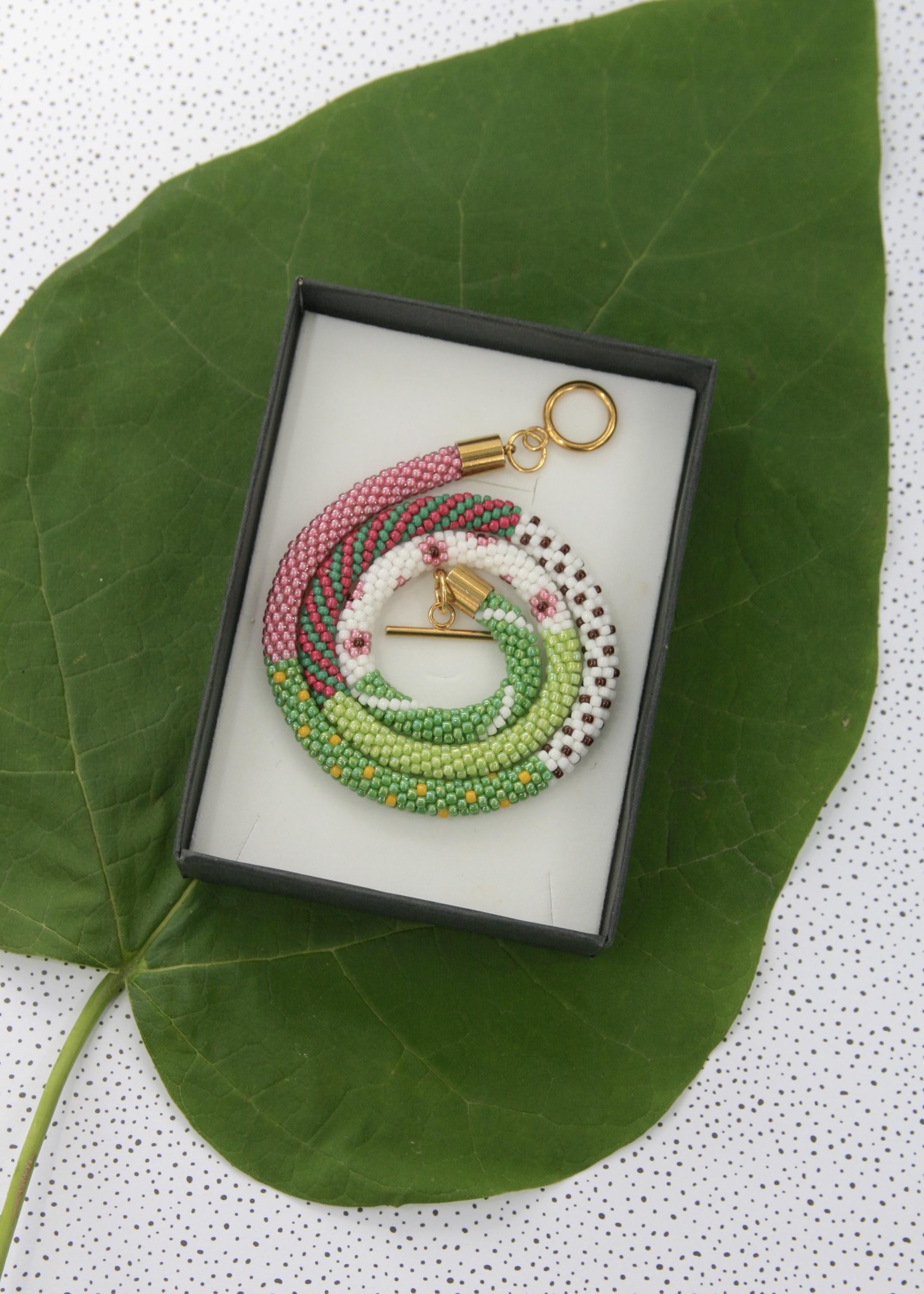 Bring a splash of summer to your style with this vibrant, handmade beaded necklace inspired by juicy kiwi colors. Carefully crocheted by hand using approximately 1,600 tiny (2mm) glass seed beads in light pink, white and green hues, this unique piece is a celebration of warm, sunny days and carefree summer vibes.