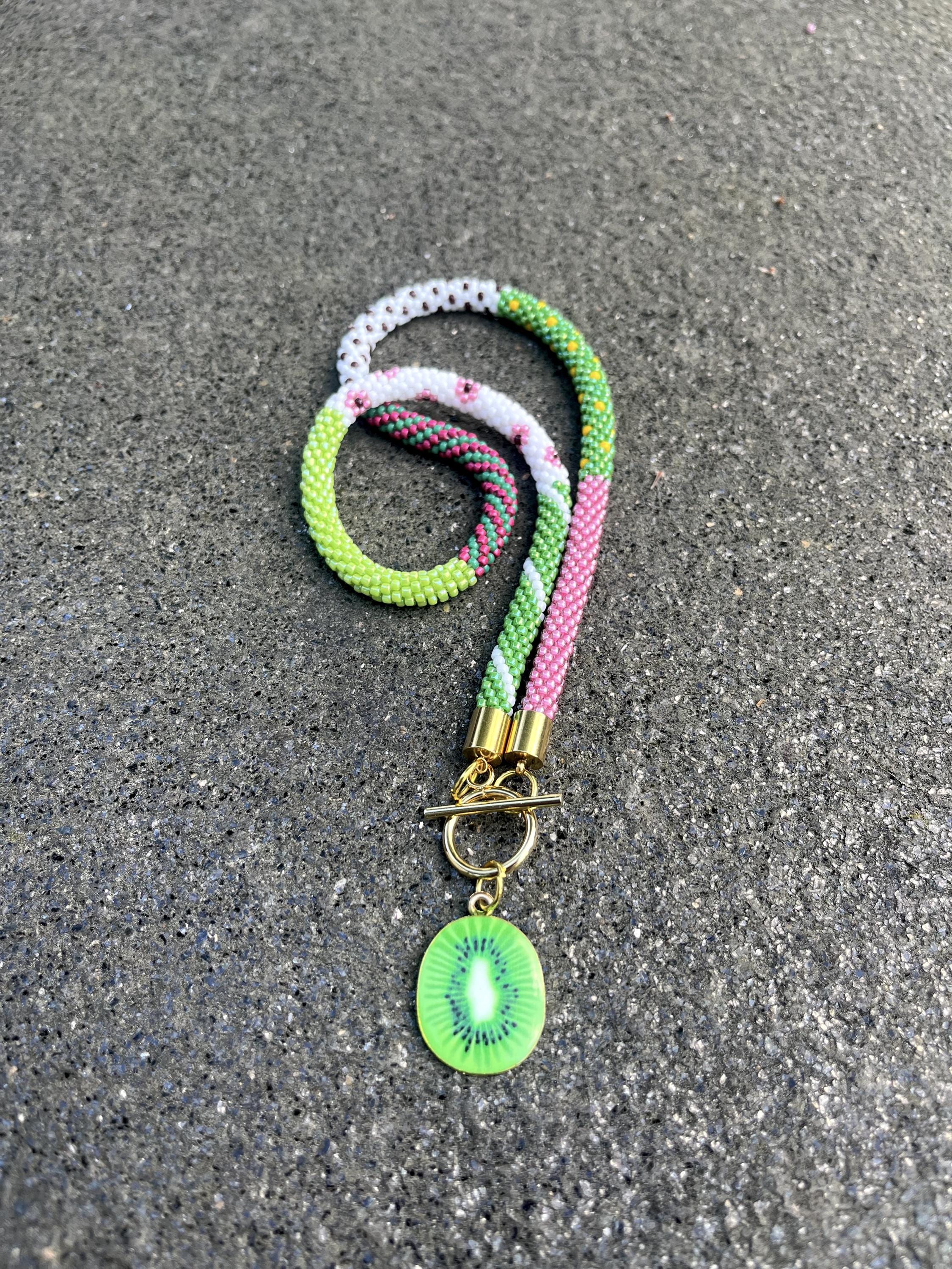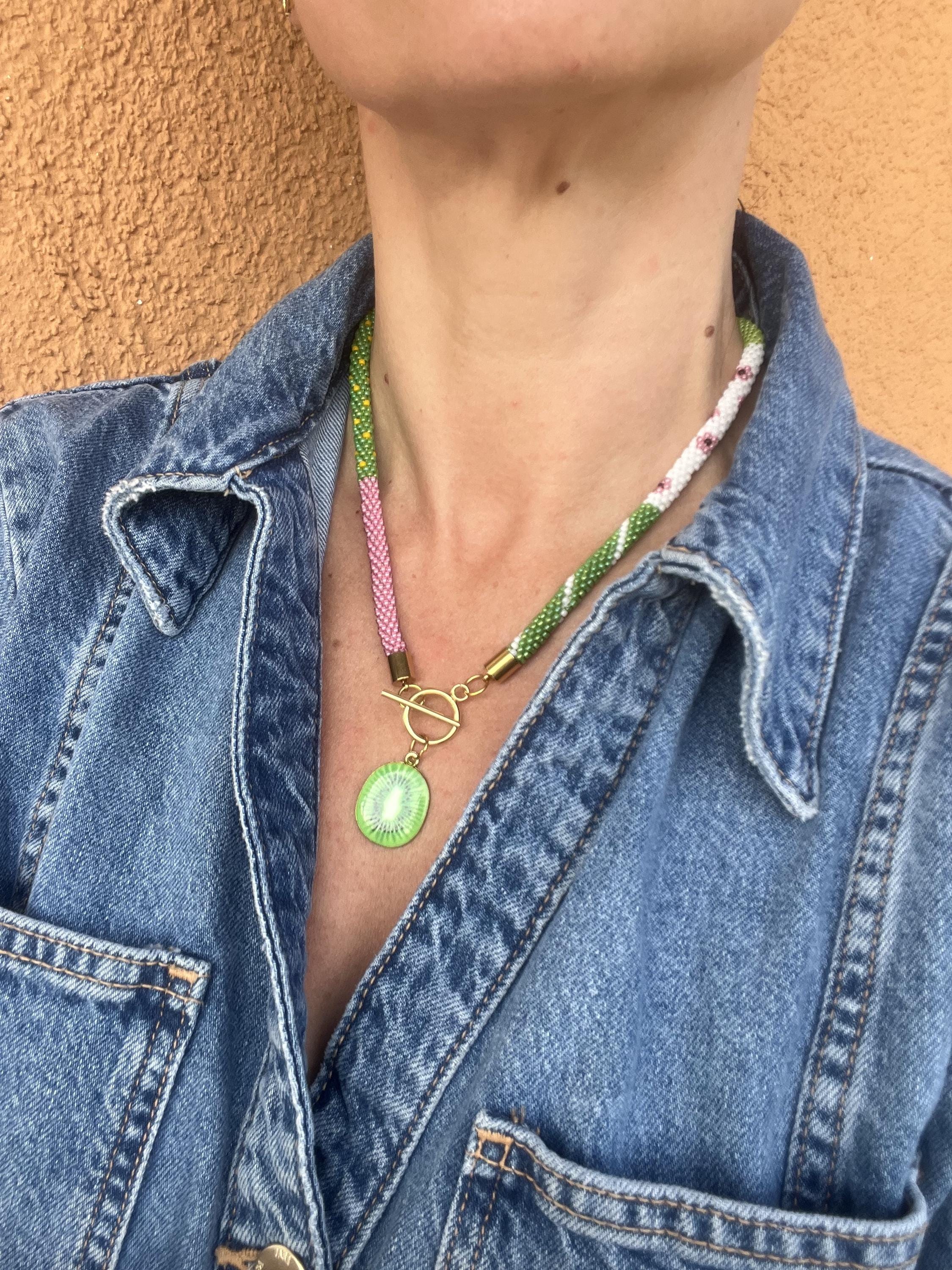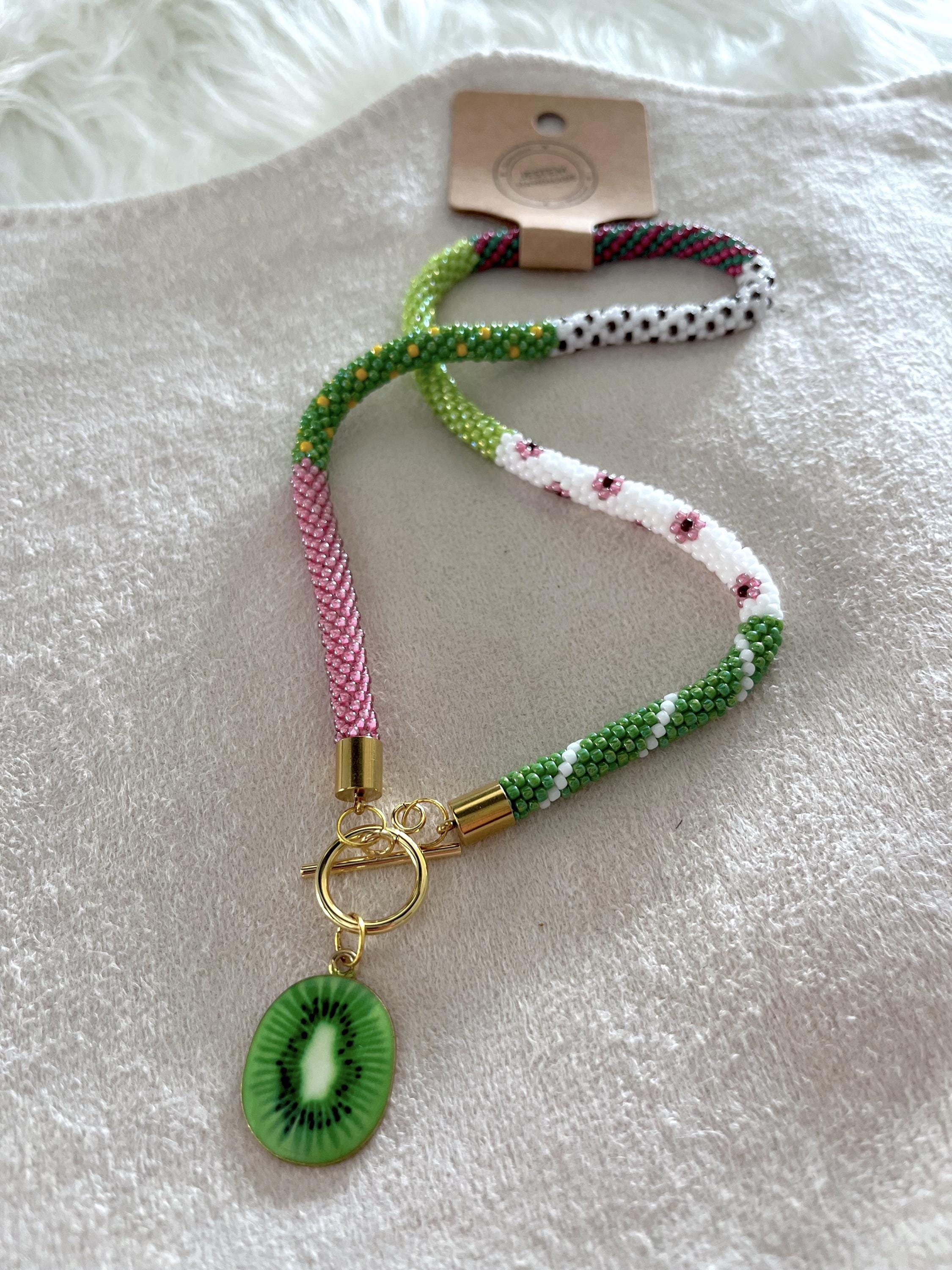 Each necklace takes around 6 hours to create and requires great attention to detail and patience, making it truly one of a kind. Finished with a gold-toned metal clasp and a charming kiwi slice pendant, this accessory adds a playful yet elegant touch to your summer wardrobe.