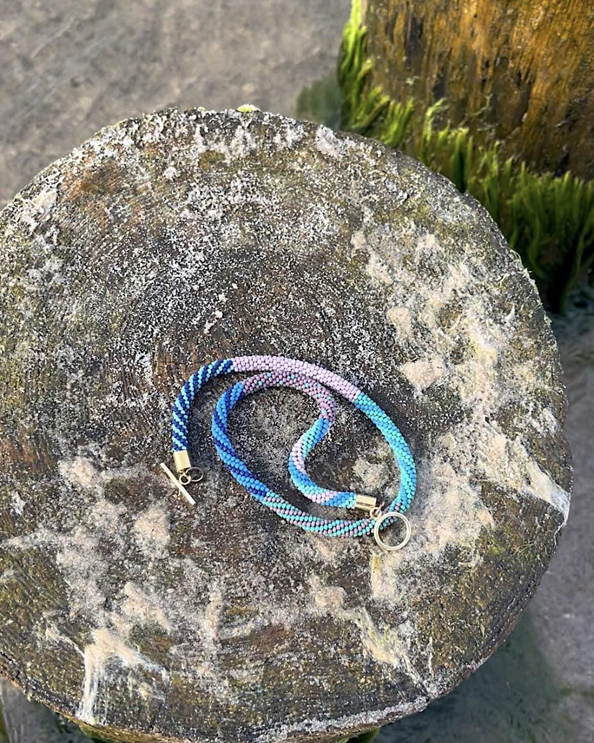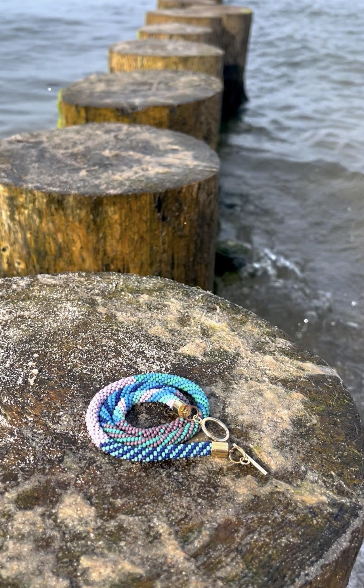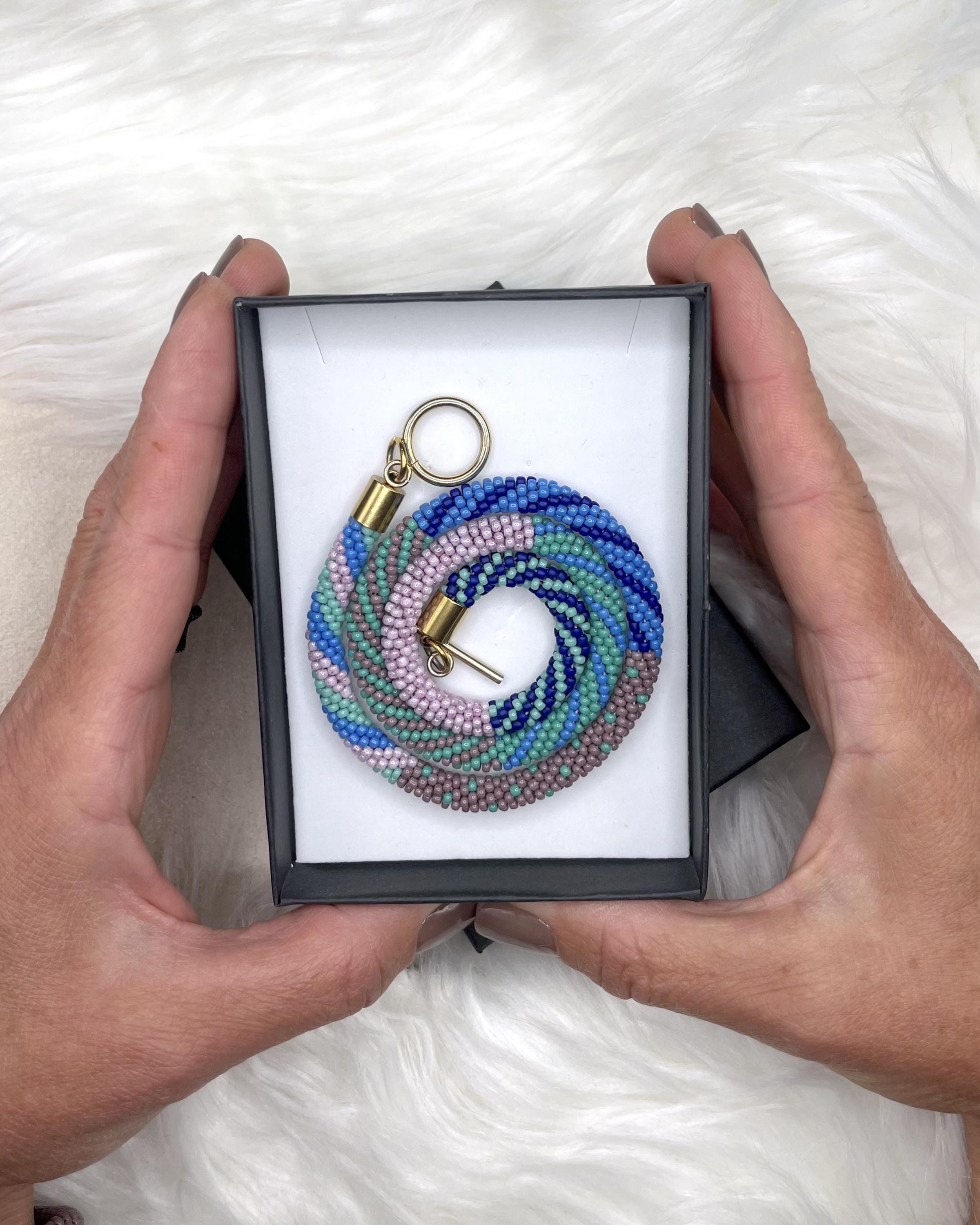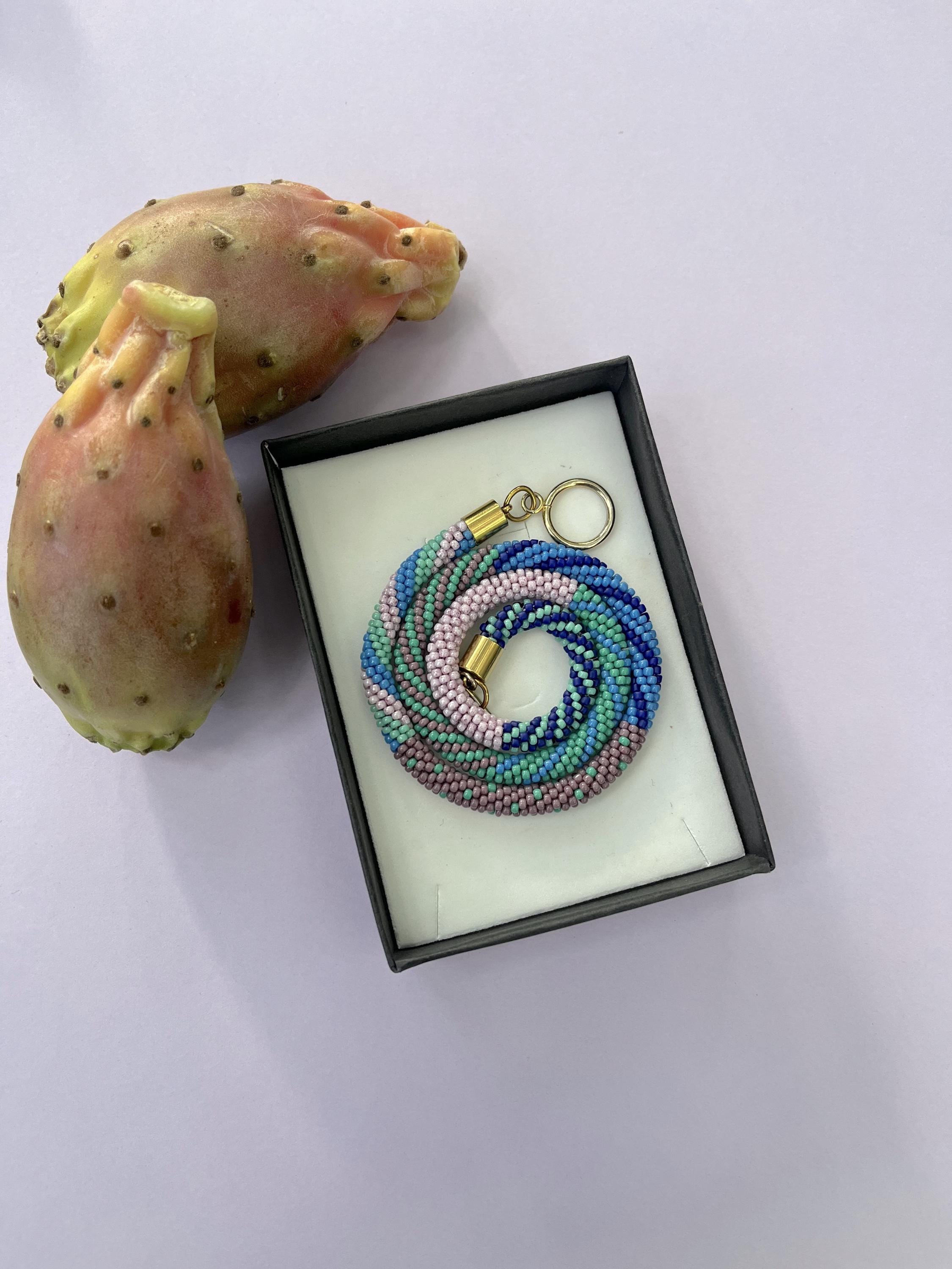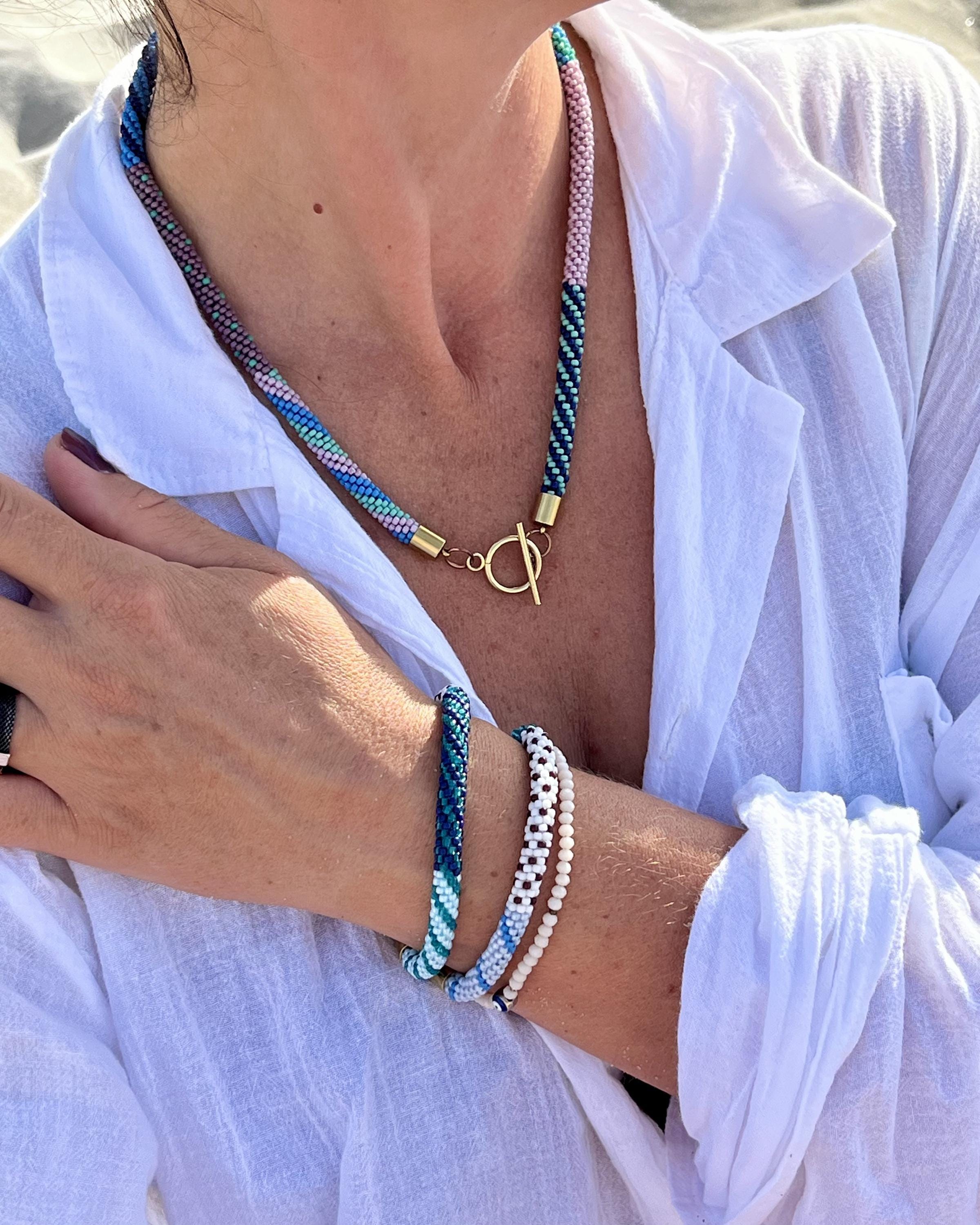Bring a splash of summer to your style with this vibrant, handmade beaded necklace inspired by juicy colors. Carefully crocheted by hand using approximately 1,600 tiny (2mm) glass seed beads in rich blue, teal and pink hues, this unique piece is a celebration of warm, sunny days and carefree summer vibes.