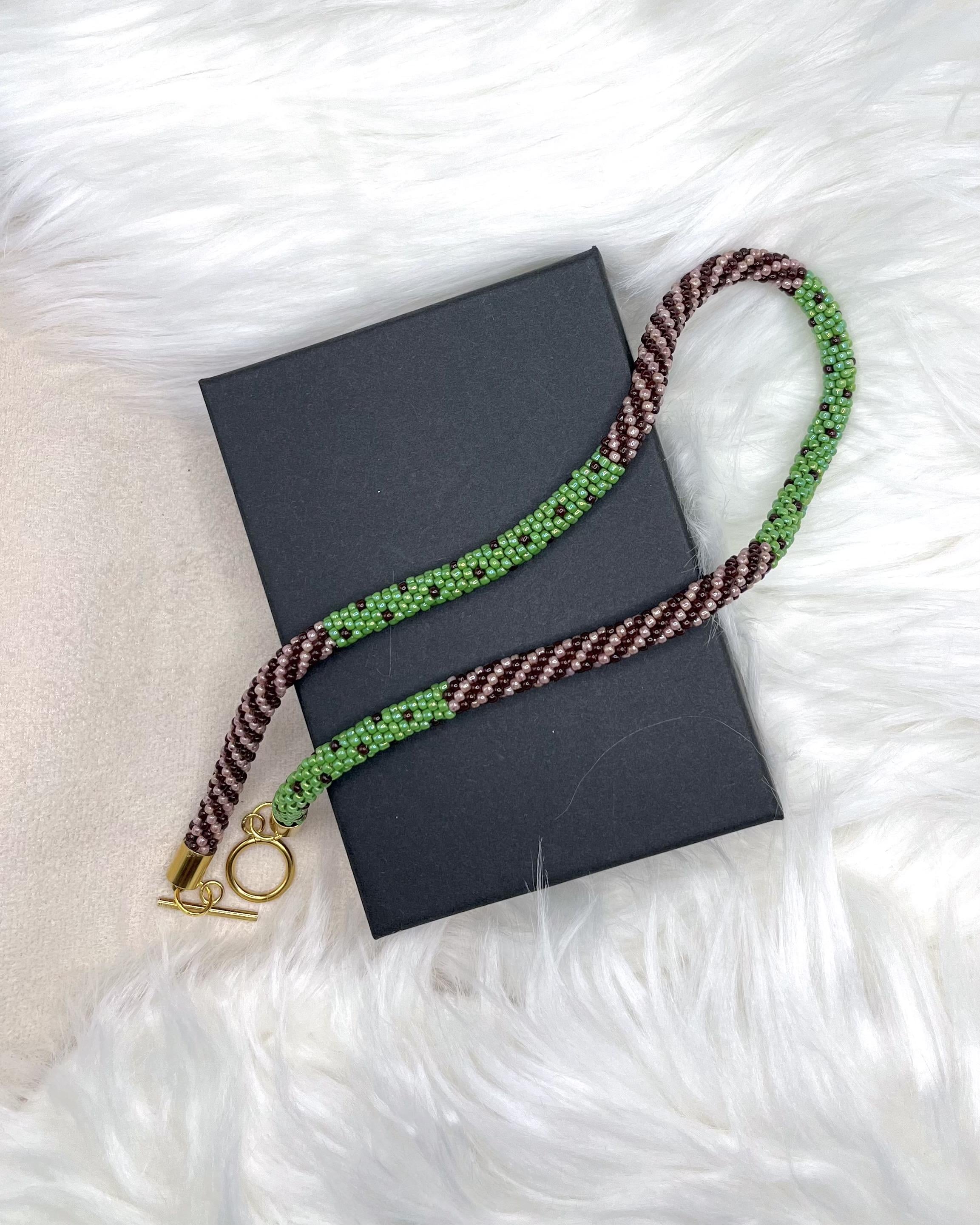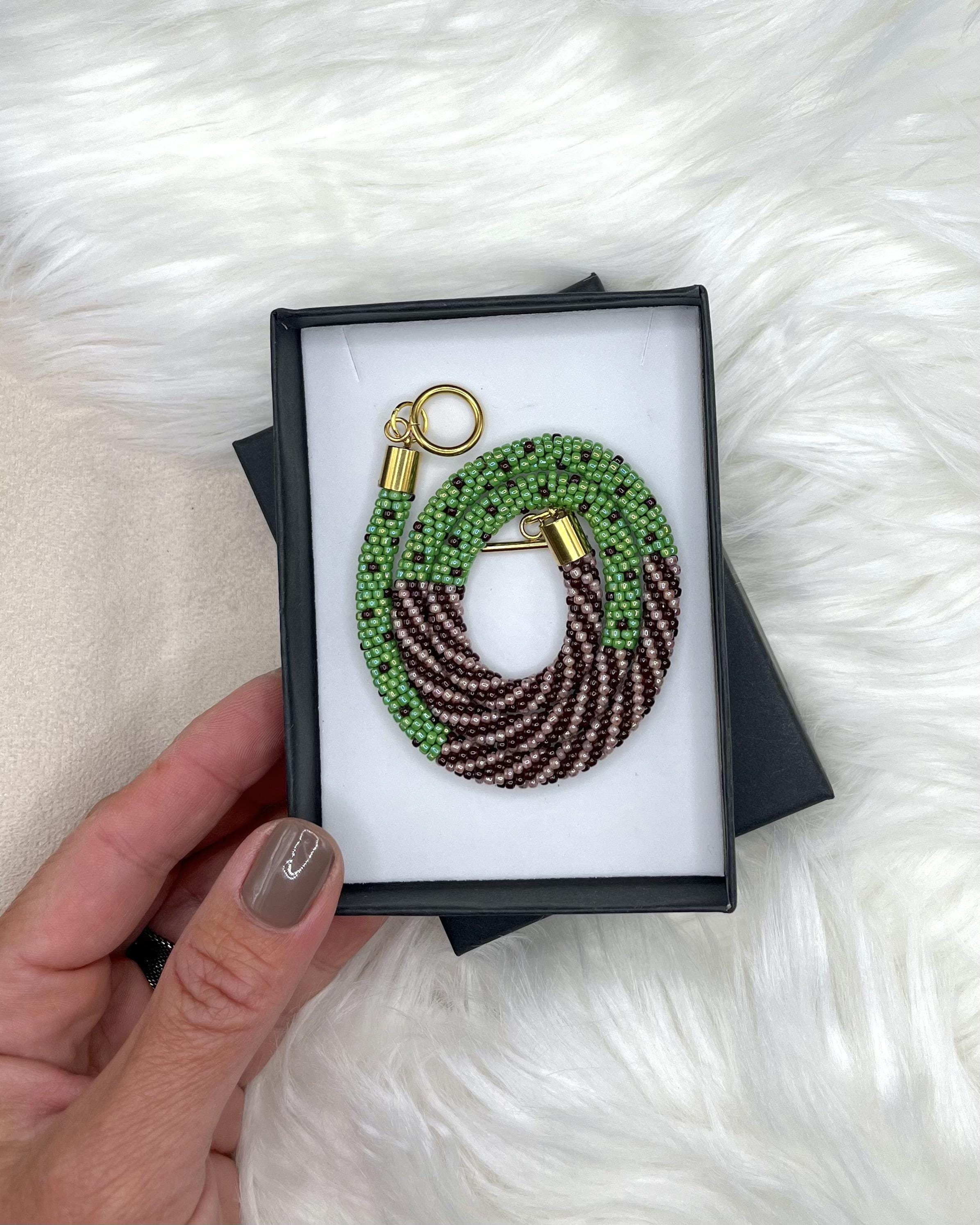 Bring a splash of summer to your style with this vibrant, handmade beaded necklace inspired by juicy kiwi colors. Carefully crocheted by hand using approximately 1,600 tiny (2mm) glass seed beads in brown and green hues, this unique piece is a celebration of warm, sunny days and carefree summer vibes.